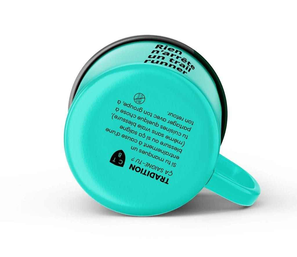 Tasse turquoise de métal émaillé avec rebord noir et phrase « Rien n’arrête un trailrunner » Sous la tasse, vous pouvez lire la "Tradition Ça saigne-tu ?"